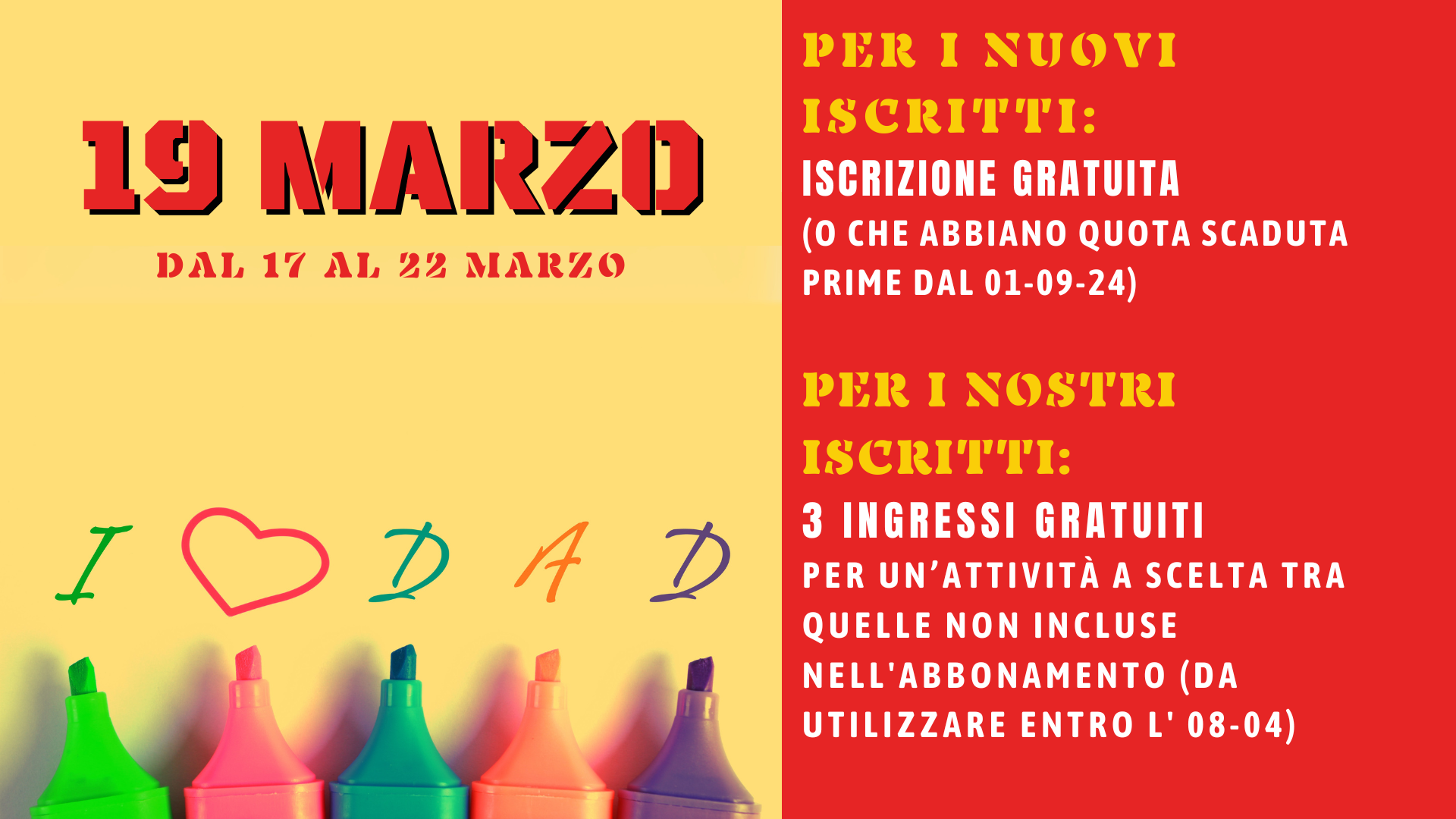 Invitiamo a condividere questa promozione con quante più persone possibile, affinché possano trarne beneficio! Per ulteriori informazioni o per aderire alle promozioni, siamo a disposizione tramite email, telefono o direttamente presso la segreteria.Viva i Papà!