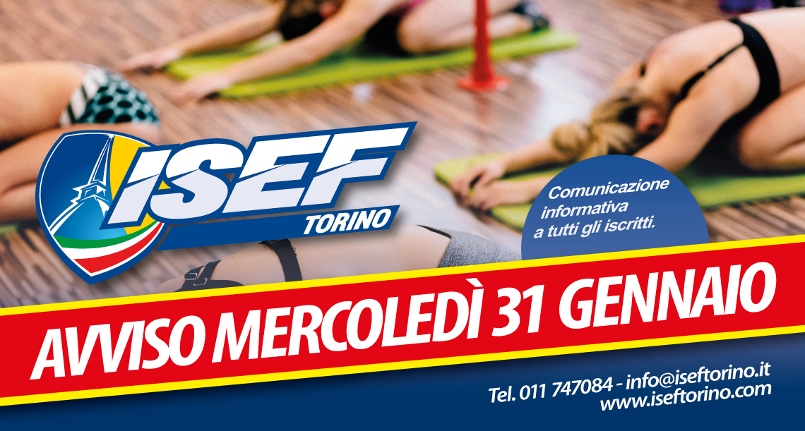 Mercoledì 31 GENNAIO non ci saranno lezioni di yoga. Ci scusiamo per il disagio. Grazie per la comprensione, lo staff di Isef Torino