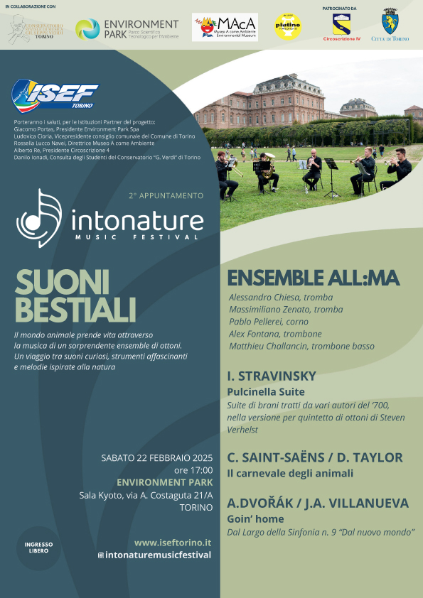 Sabato 22 febbraio 2025 Prosegue InToNature, il festival urbano di musica d’insieme promosso dall’ISEF in collaborazione con il Conservatorio di Torino ed Environment Park, patrocinato dalla Circoscrizione 4 e dal Comune di Torino. Dopo la magia del Trio Farrenc, saremo lieti di accogliervi per “Suoni Bestiali”, un concerto coinvolgente e festoso, animato da un sorprendente ensemble di ottoni formato da studenti del Conservatorio di Torino! Si tratterà di un vero e proprio viaggio musicale fra natura e arte, impreziosito dalle note del Carnevale degli animali di Saint-Saëns e dalla frizzante verve della commedia dell’arte di Stravinsky, pensato per regalare emozioni a grandi e piccini. I docenti della Scuola di Musica dell’ISEF saranno a disposizione per accompagnare il pubblico alla scoperta di trombe, corni e tromboni, con storie e curiosità sugli strumenti. Quando e dove? Data: 22 febbraio 2025 Luogo: sala "Kyoto" dell’Environment Park – via Costaguta 21, Torino. Ingresso libero, vi invitiamo a non mancare! Vi aspettiamo numerosi per un pomeriggio di musica, emozioni e… suoni bestiali!