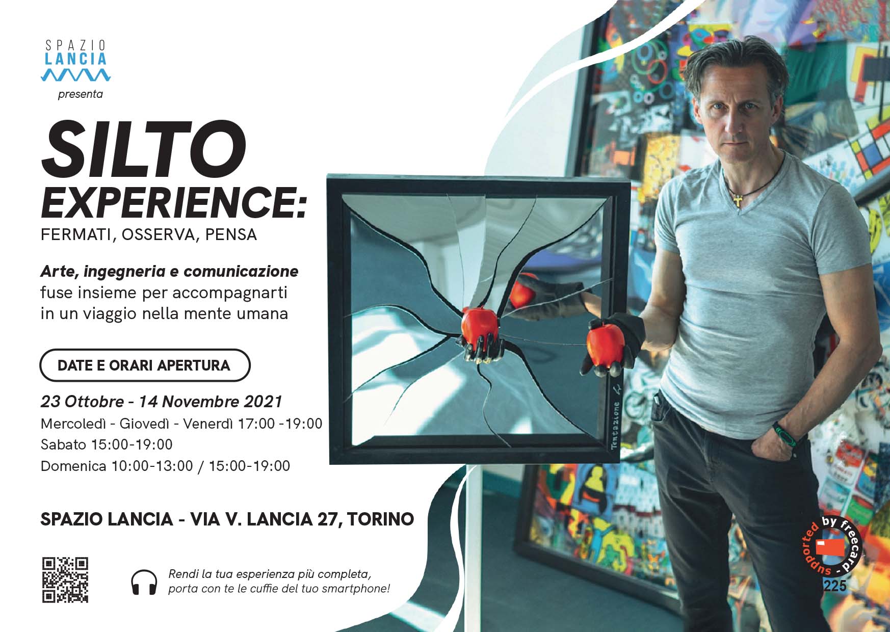Silto Experience: fermati, osserva, pensa”: mostra, esposizione o più pertinentemente “Esperienza”, è la prima personale di Carlo Siletto (in arte Silto) torinese ed ingegnere poliedrico. Un viaggio all’interno della mente umana, un insieme di immagini, parole musiche e pensieri per raggiungere cuore ma soprattutto mente dell’osservatore.