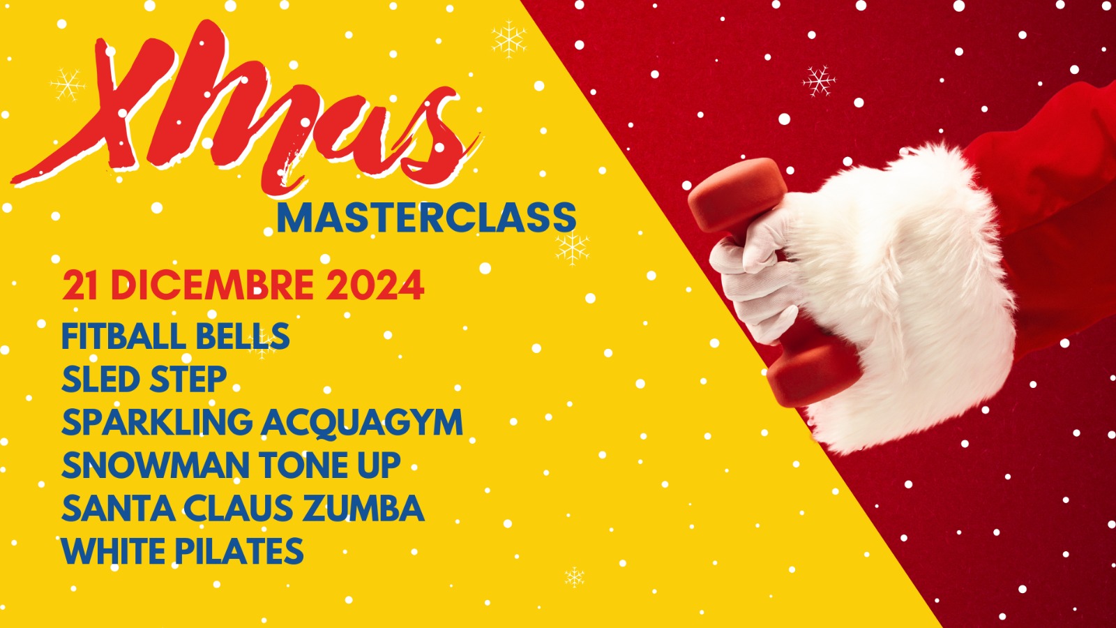 Questo 21 dicembre, preparatevi a vivere lo spirito natalizio con un tocco di energia e benessere presso l'ISEF con la nostra Xmass Masterclass! Una giornata interamente dedicata al fitness natalizio, con sessioni speciali progettate per tutti gli appassionati di benessere e divertimento.